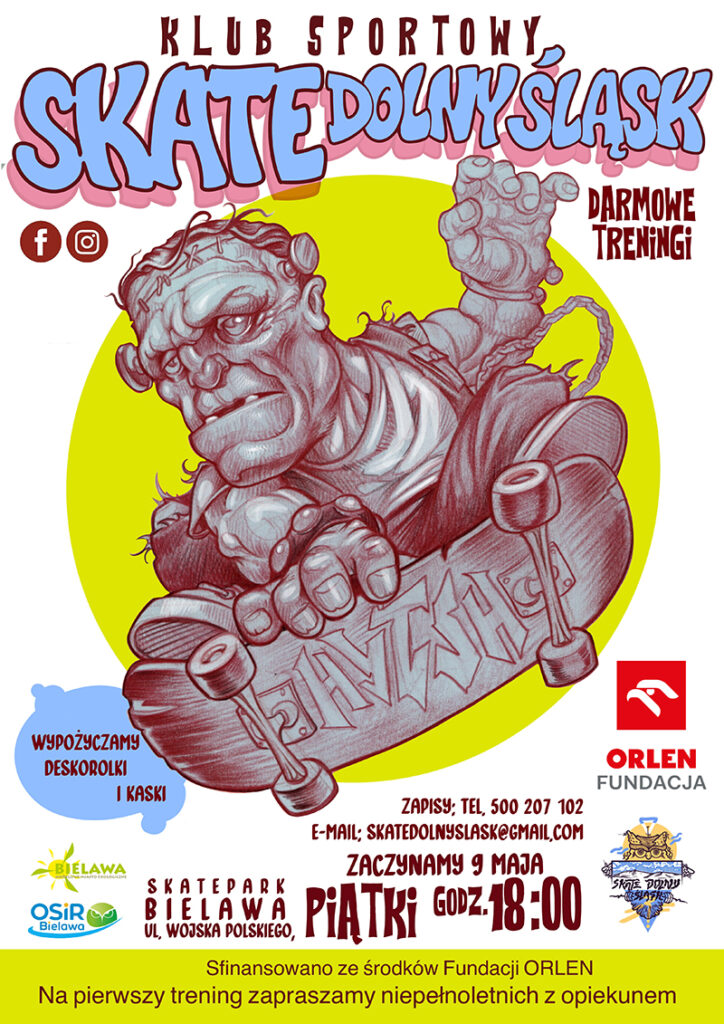 W 2025 roku prowadzimy bezpłatne Treningi Deskorolki w 6 miastach Dolnego Śląska w ramach akcji Sportowy Orlen.