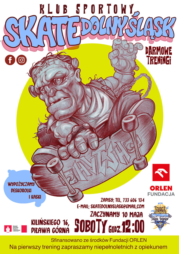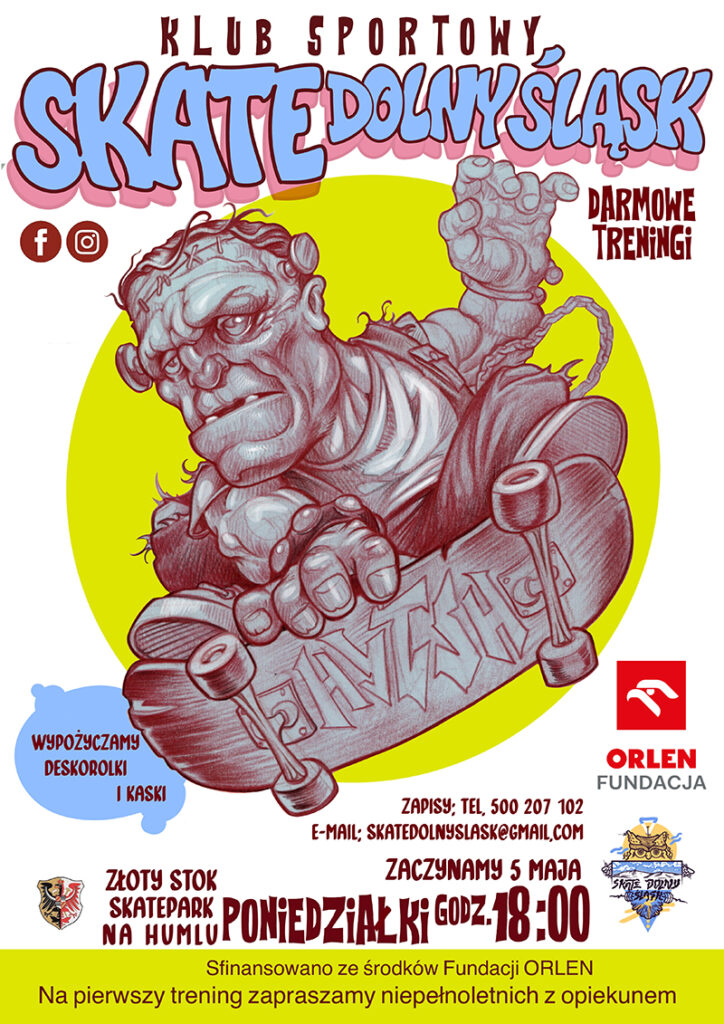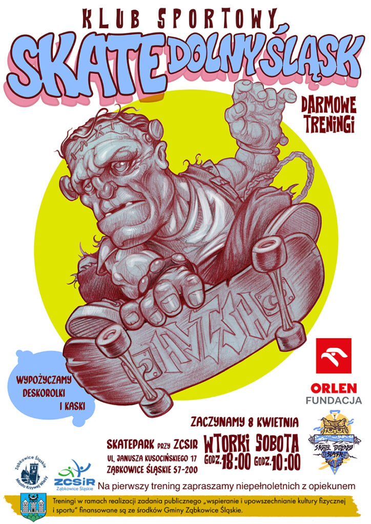 W 2025 roku po raz trzeci mamy przyjemność zaprosić Państwa na bezpłatne zajęcia deskorolki w Ząbkowicach Śląskich organizowane dzięki uprzejmości Gminy Ząbkowice Śląskie oraz Fundacji Sportowy Orlen. W każdy wtorek o 18:00 i w każdą sobotę o 10:00 czekamy na Was na skateparku w Ząbkowicach Śląskich.